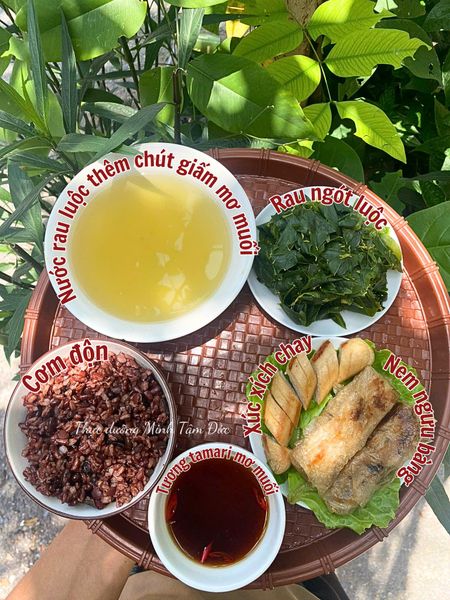 Bữa cơm chay này vừa giúp cân bằng hệ tiêu hóa, lại nhẹ nhàng cho cơ thể, đặc biệt là tốt cho những ai đang cần chăm sóc đại tràng. Cơm lứt và các loại đậu cung cấp đầy đủ 18 axit amin thiết yếu, rau ngót giúp thanh nhiệt, bổ máu. Nem ngưu bàng và xúc xích chay vừa ngon miệng lại giàu chất xơ, hỗ trợ hệ vi sinh đường ruột. Nước tương tamari pha với nước cốt chanh và ớt thì khỏi phải nói – tăng hương vị mà không cần đến mì chính hay chất tạo ngọt.