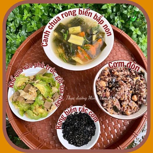 Bữa cơm chay thực dưỡng của đại gia đình Thực dưỡng Minh Tâm Đức hôm nay đơn giản không cầu kỳ nhưng vẫn đủ các dưỡng chất đạm, xơ, và các vitamin cần thiết gồm cơm độn, canh chua rong biển bắp non, khổ qua xào phù trúc giò lụa chay và rong biển rắc cơm thơm mè.