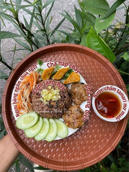 🌱 Cơm tấm chay gồm có: 200g cơm gạo lứt dẻo Điện Biên độn đậu đỗ hạt cốc nấu chín, 50g chả hấp chay, 30g dưa chuột, 30g ngưu bàng ngâm chua ngọt, 2 miếng chả rong biển chiên giòn Thực dưỡng Minh Tâm Đức, 5g hành lá thái nhỏ, 2 thìa cafe dầu mè Thực dưỡng Minh Tâm Đức, 1/2 muỗng canh tamari lâu năm Thực dưỡng Minh Tâm Đức, 1/2 muỗng canh đường thốt nốt, 3g bột sắn dây hữu cơ Thực dưỡng Minh Tâm Đức. Nước chấm pha từ tamari, nước mơ muối, đường thốt nốt, tỏi băm và ớt thái lát.