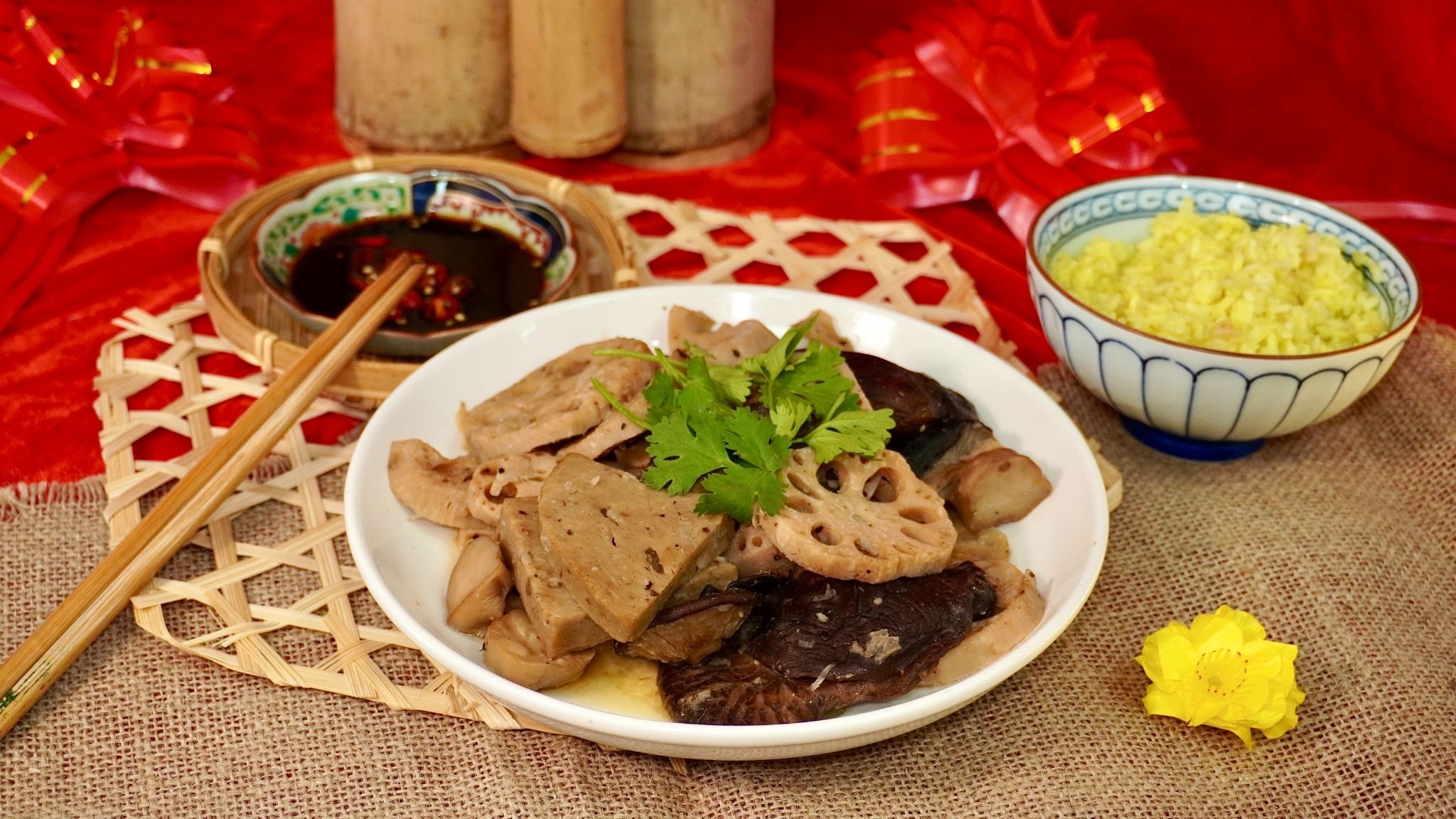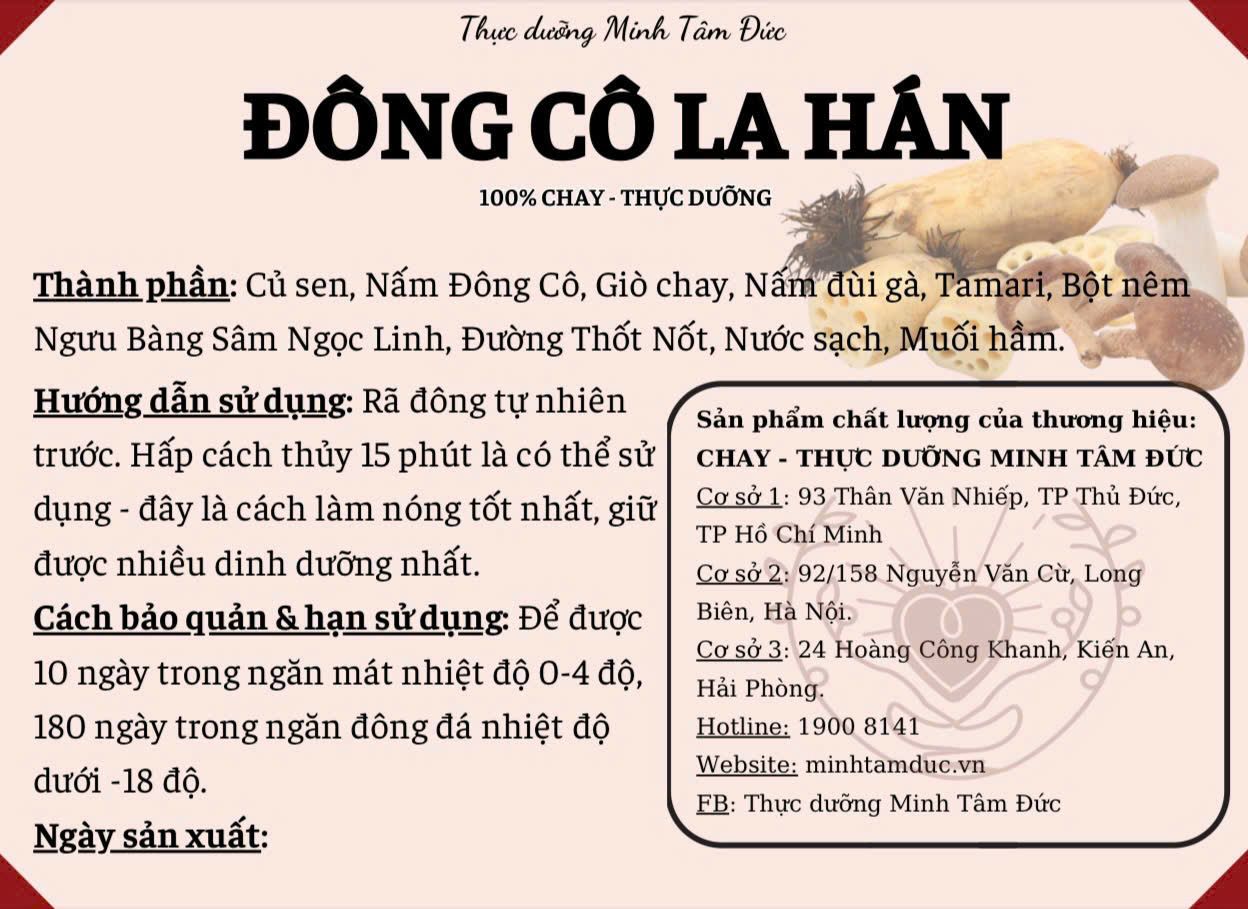 Thành phần: Củ sen, Nấm Đông Cô, Giò chay, Nấm đùi gà, Tamari, Bột nêm Ngưu Bàng Sâm Ngọc Linh, Đường Thốt Nốt, Nước sạch, Muối hầm.